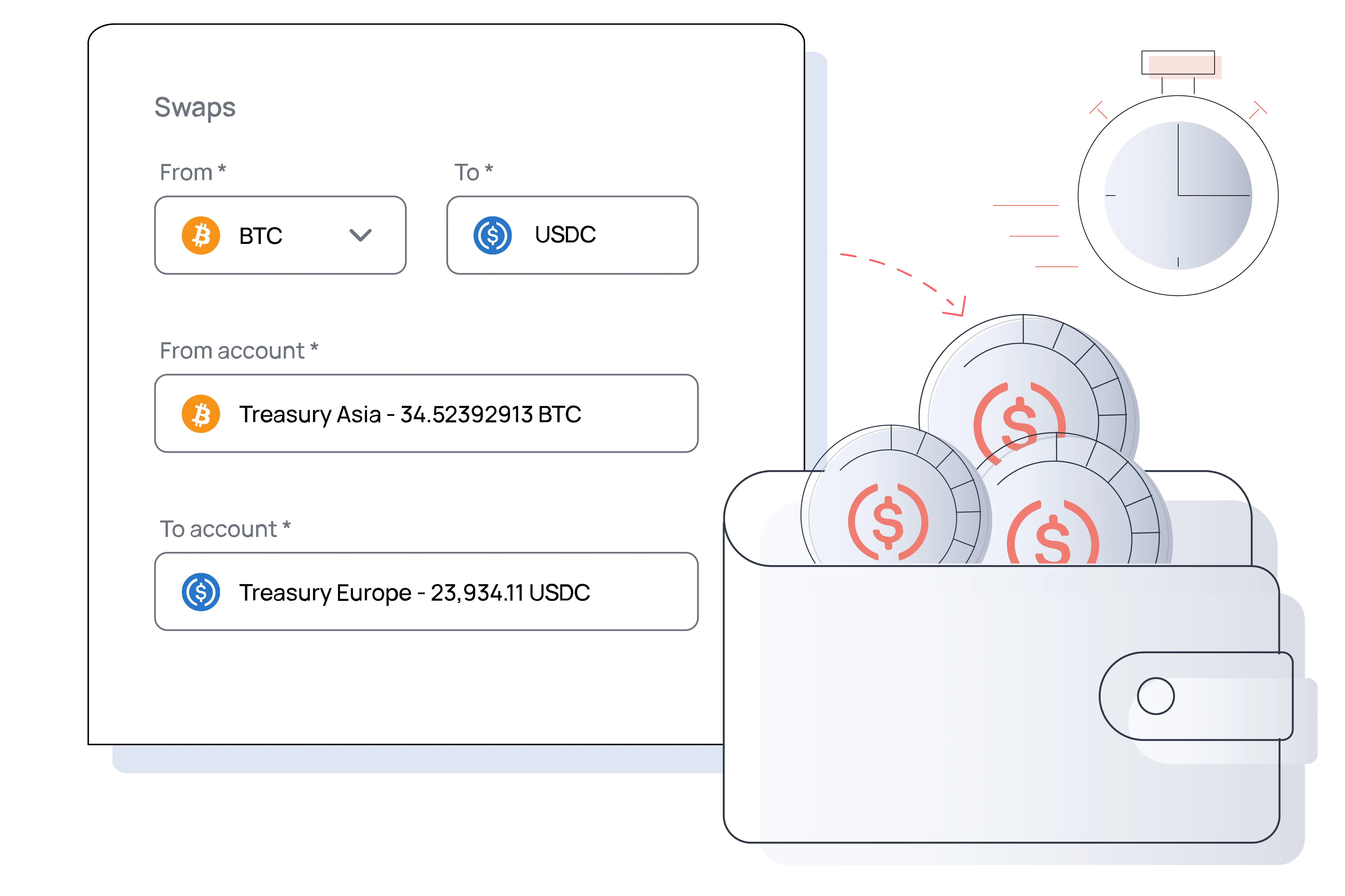 Fortris lets you convert BTC, stablecoins and other cryptocurrencies directly in the platform. With no external exchanges or delays, every swap is secured, auditable and governed by your existing controls, so your treasury moves fast without compromising insight.